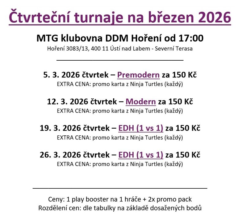Čtvrteční turnaje na březen 2026