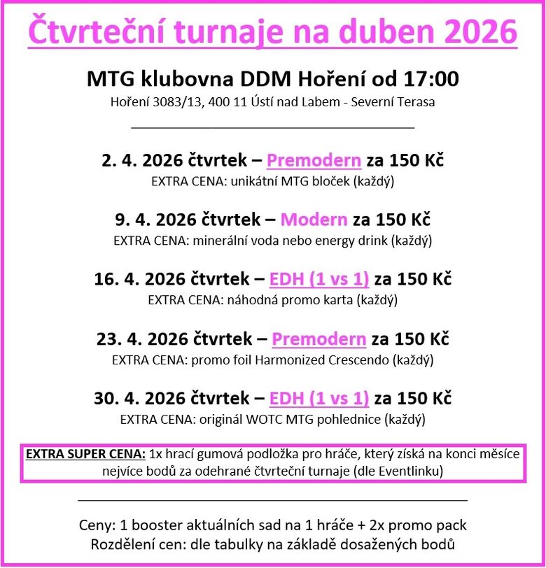 Čtvrteční turnaje na duben 2026 + bonus cena!